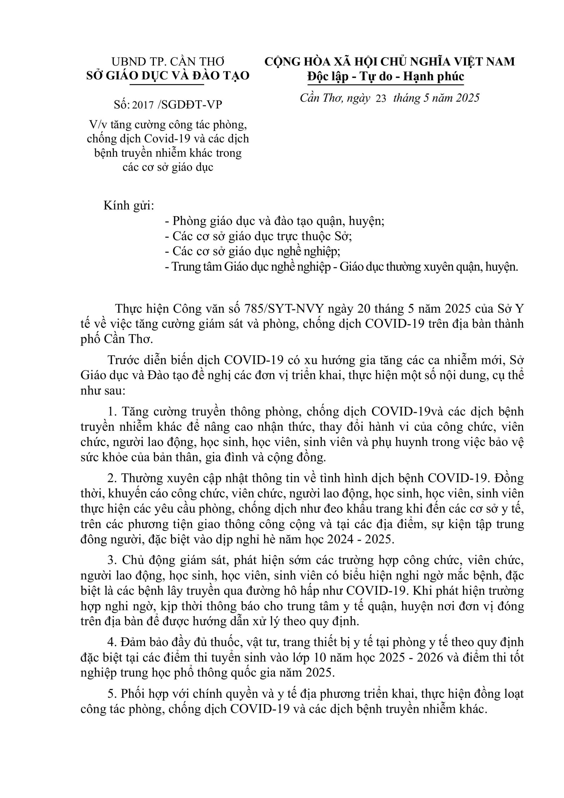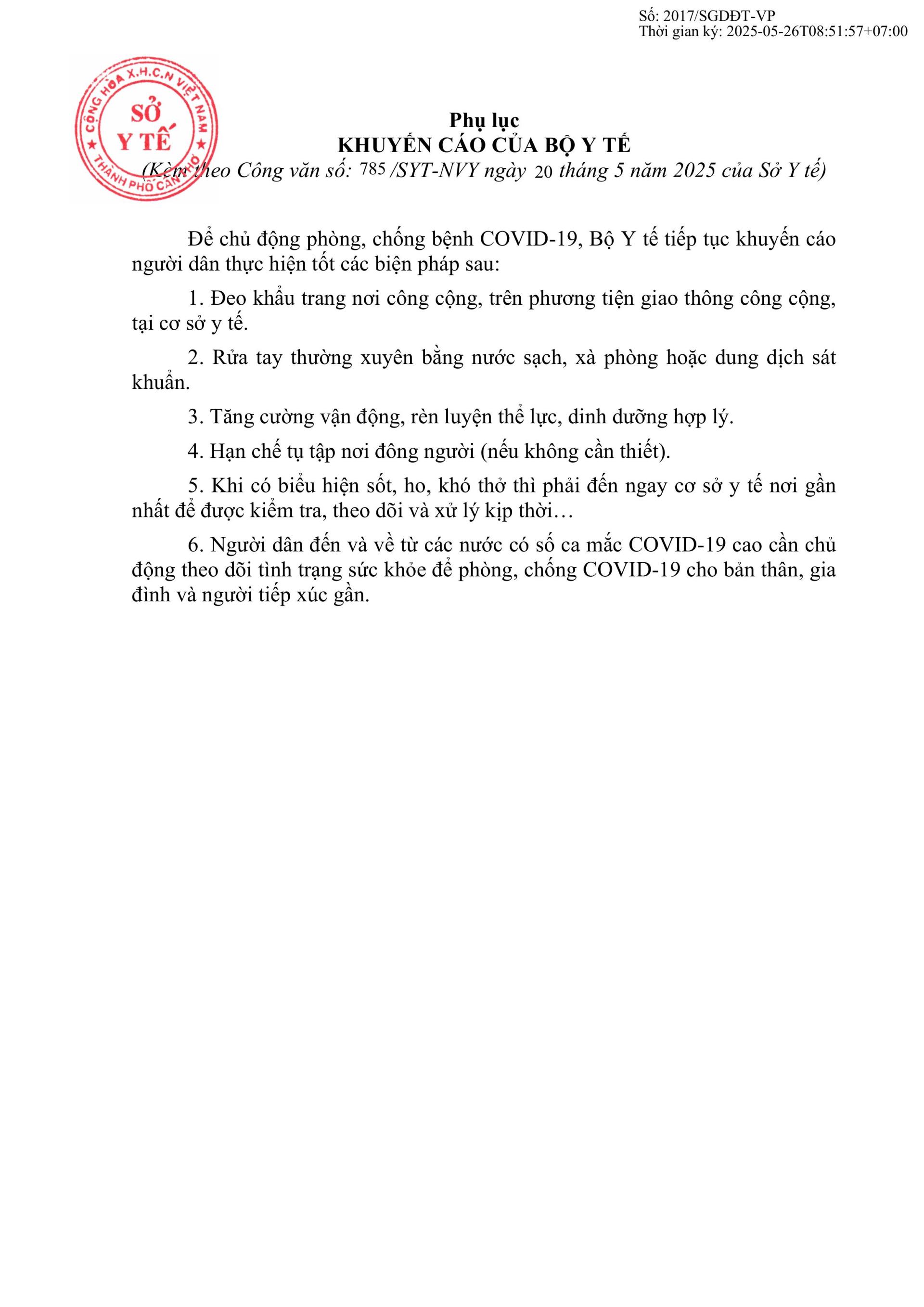 Theo khuyến cáo từ Bộ Y tế và Sở Y tế TP.Cần Thơ, tình hình dịch bệnh COVID-19 có dấu hiệu gia tăng các ca nhiễm mới. Nhằm đảm bảo sức khỏe cho học sinh, giáo viên và toàn thể nhà trường, Sở GD&ĐT TP.Cần Thơ đã có hướng dẫn cụ thể đến các đơn vị giáo dục trên địa bàn.