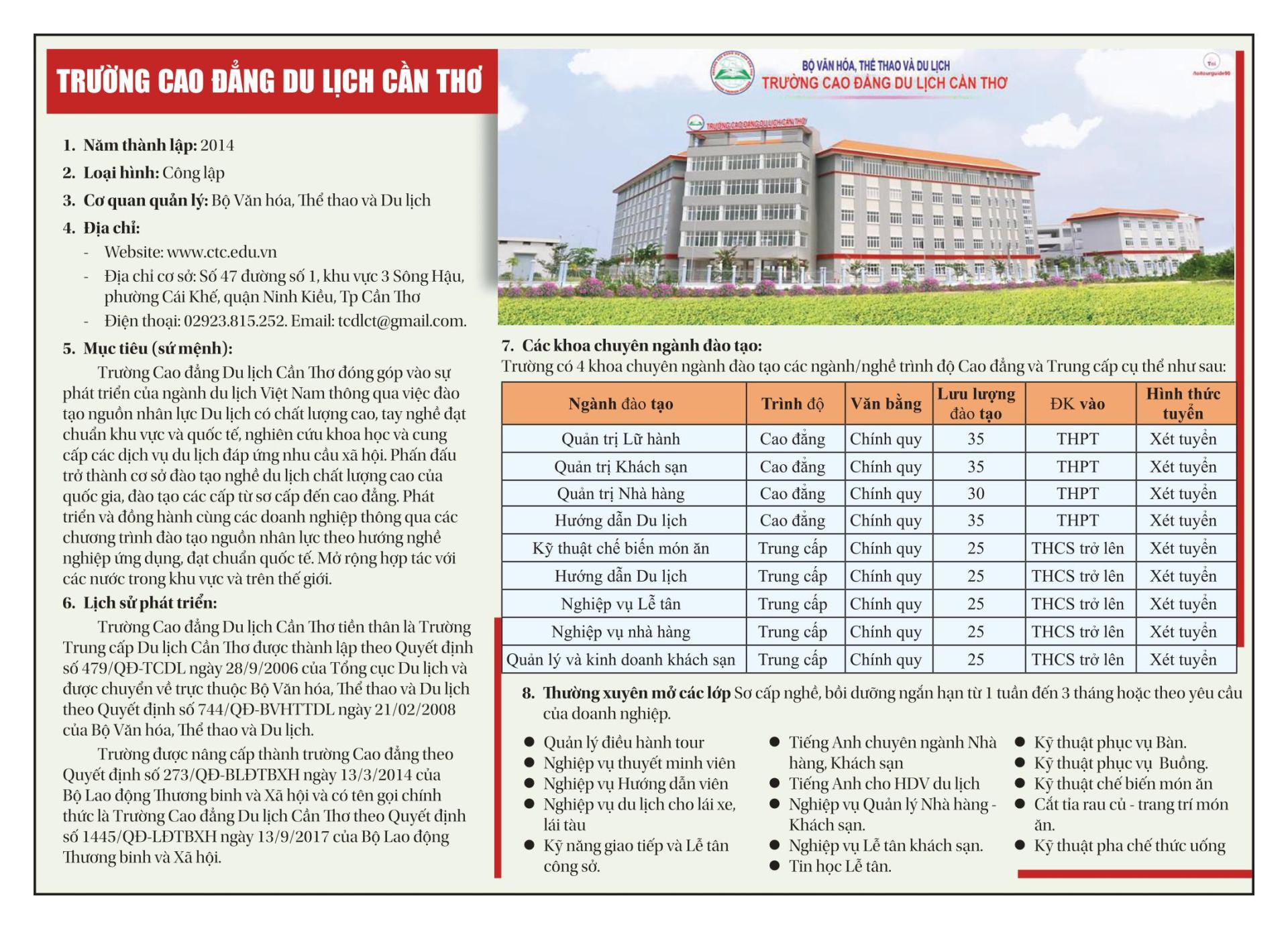 Đào tạo nguồn nhân lực kỹ thuật chất lượng cao, đáp ứng được những đòi hỏi khắt khe của thị trường lao động du lịch trong và ngoài nước, nhằm thoả mãn nhu cầu học nghề gắn với việc làm của người dân và phát triển của cộng đồng. Thực hiện các chương trình đào tạo trung cấp và cao đẳng đạt chuẩn khu vực và quốc tế, trở thành nơi đào tạo nghề về du lịch có uy tín trong khu vực Đồng bằng Sông Cửu Long và trong nước về đào tạo kiến thức, kỹ năng, thái độ nghề nghiệp, ngoại ngữ.