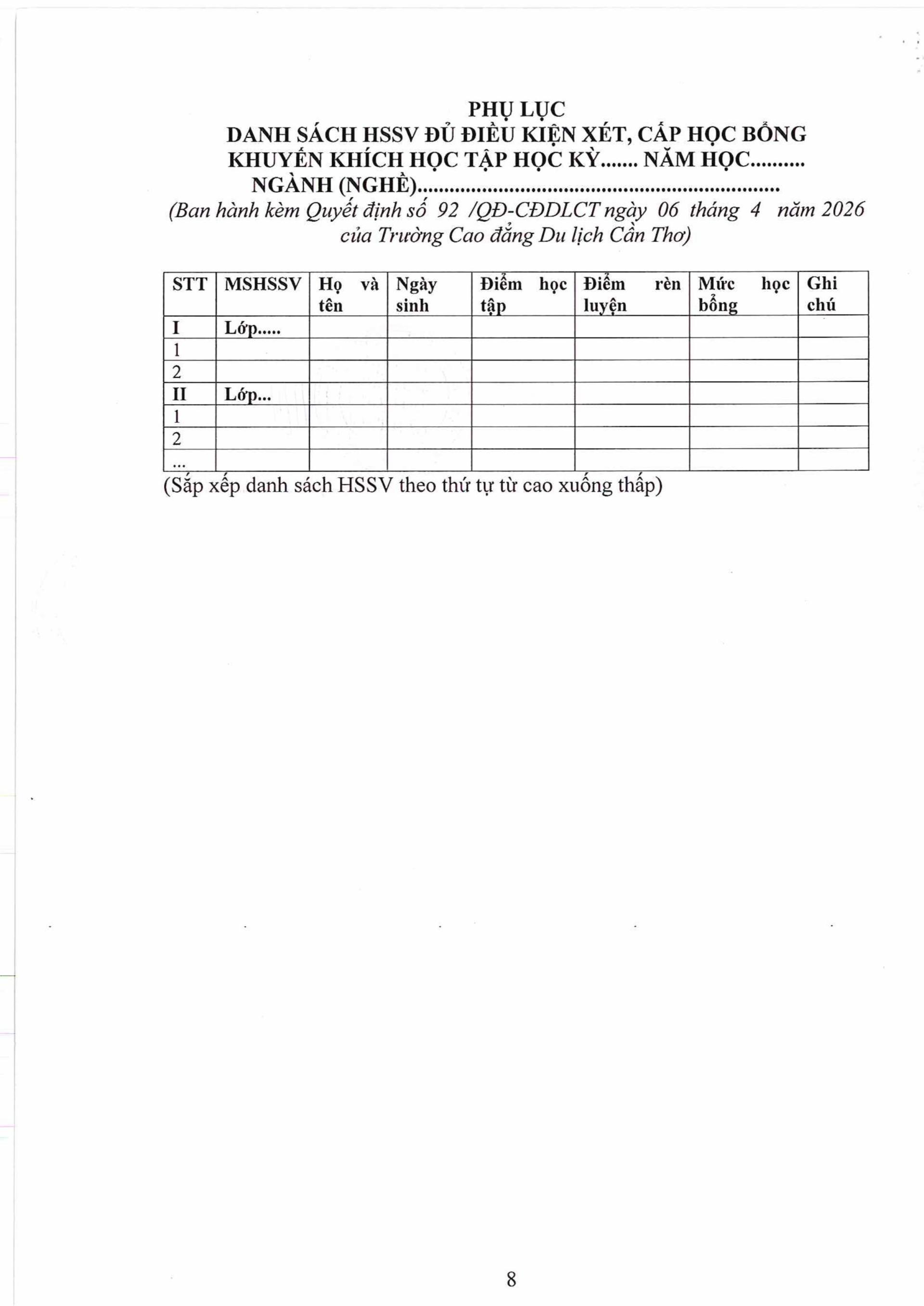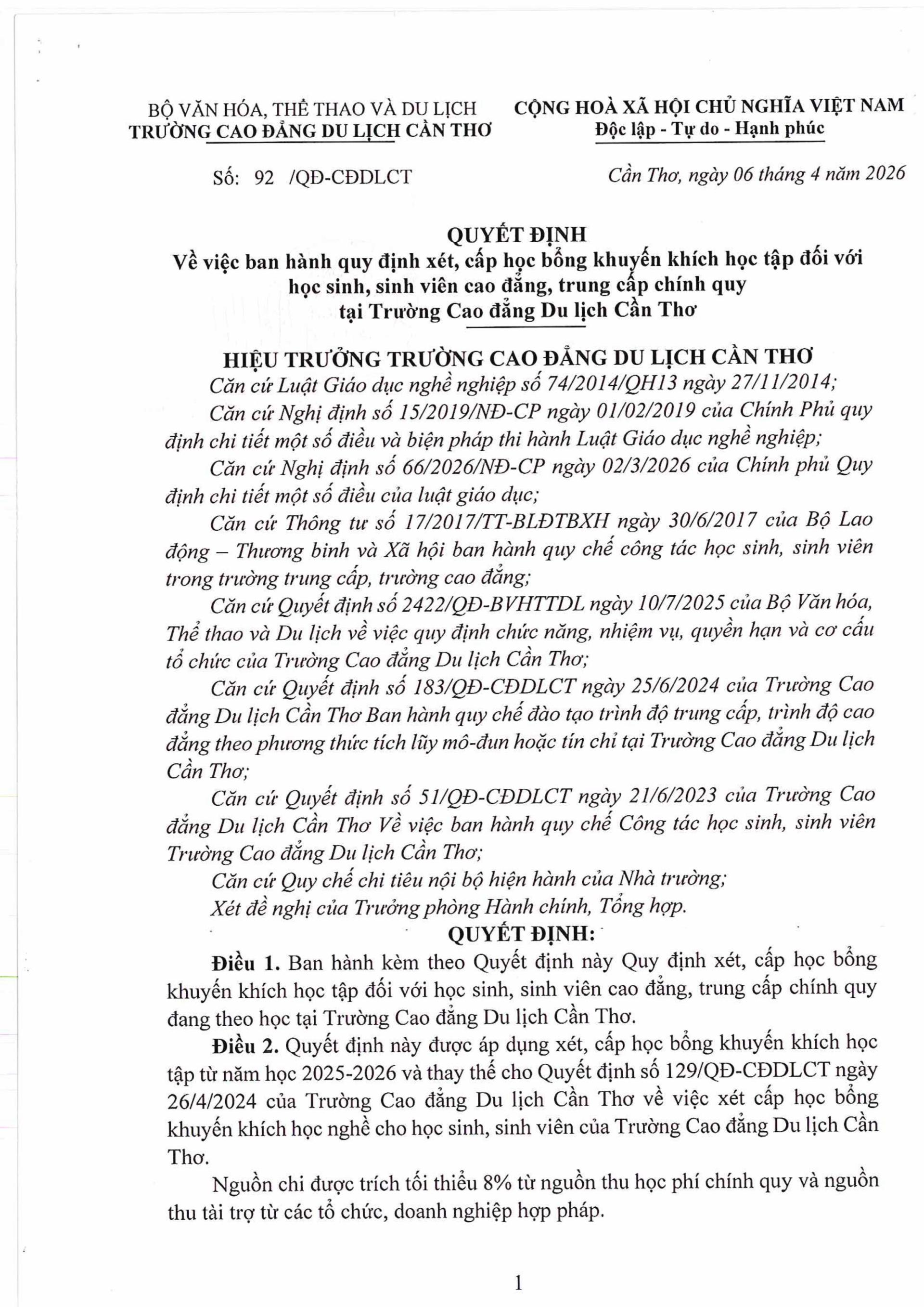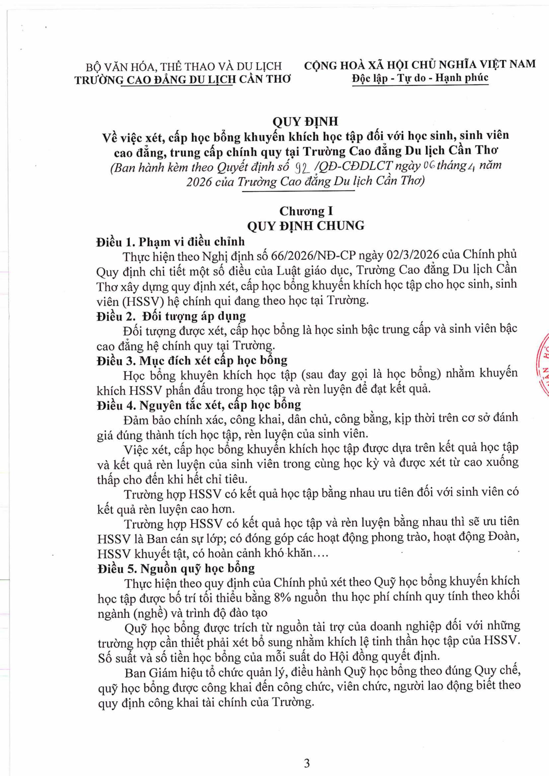 BM.9 | Quyết định ban hành quy định xét, cấp học bổng khuyến khích tập đối với HSSV Cao đẳng, Trung cấp, chính quy (Mới 2026) | |