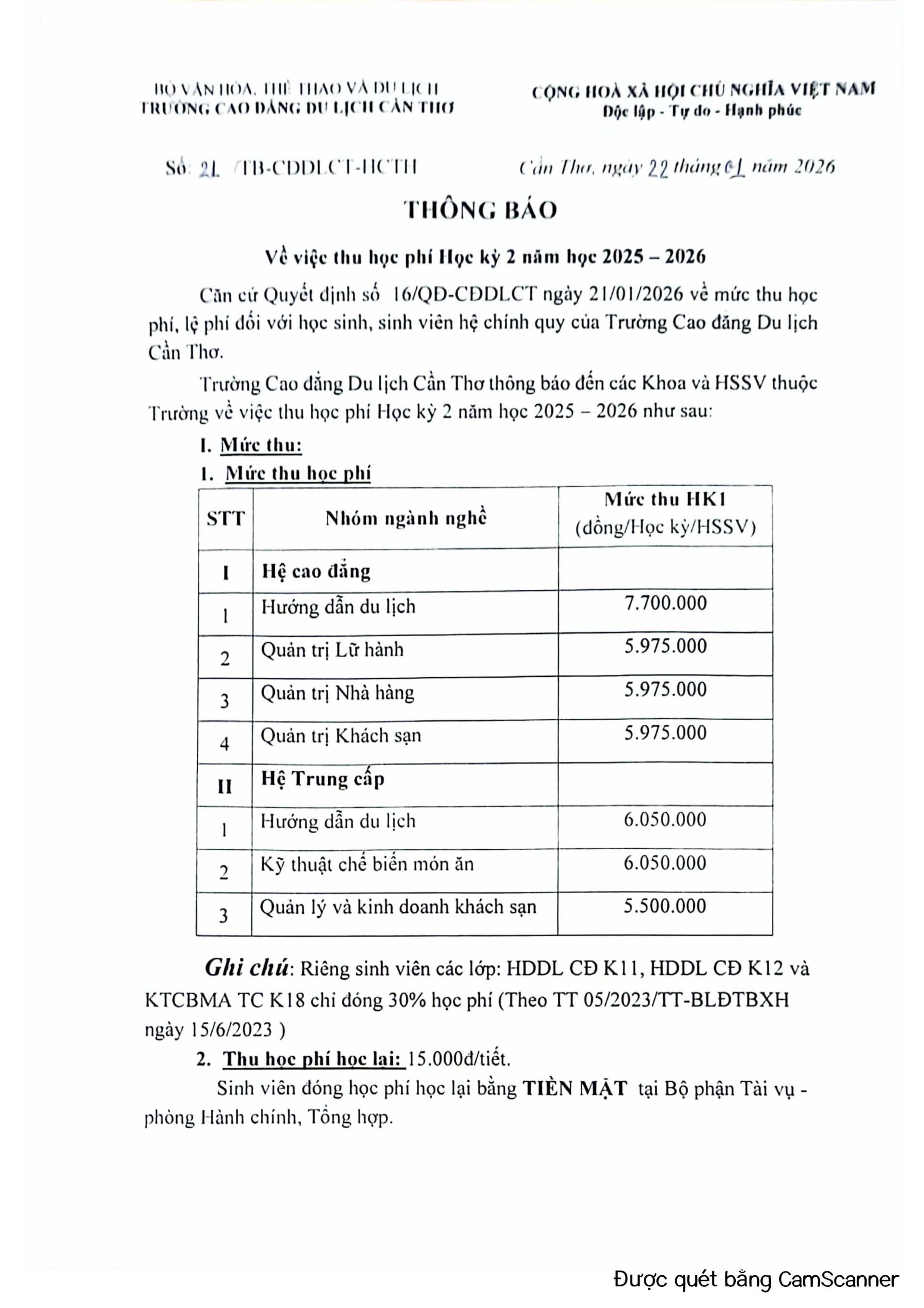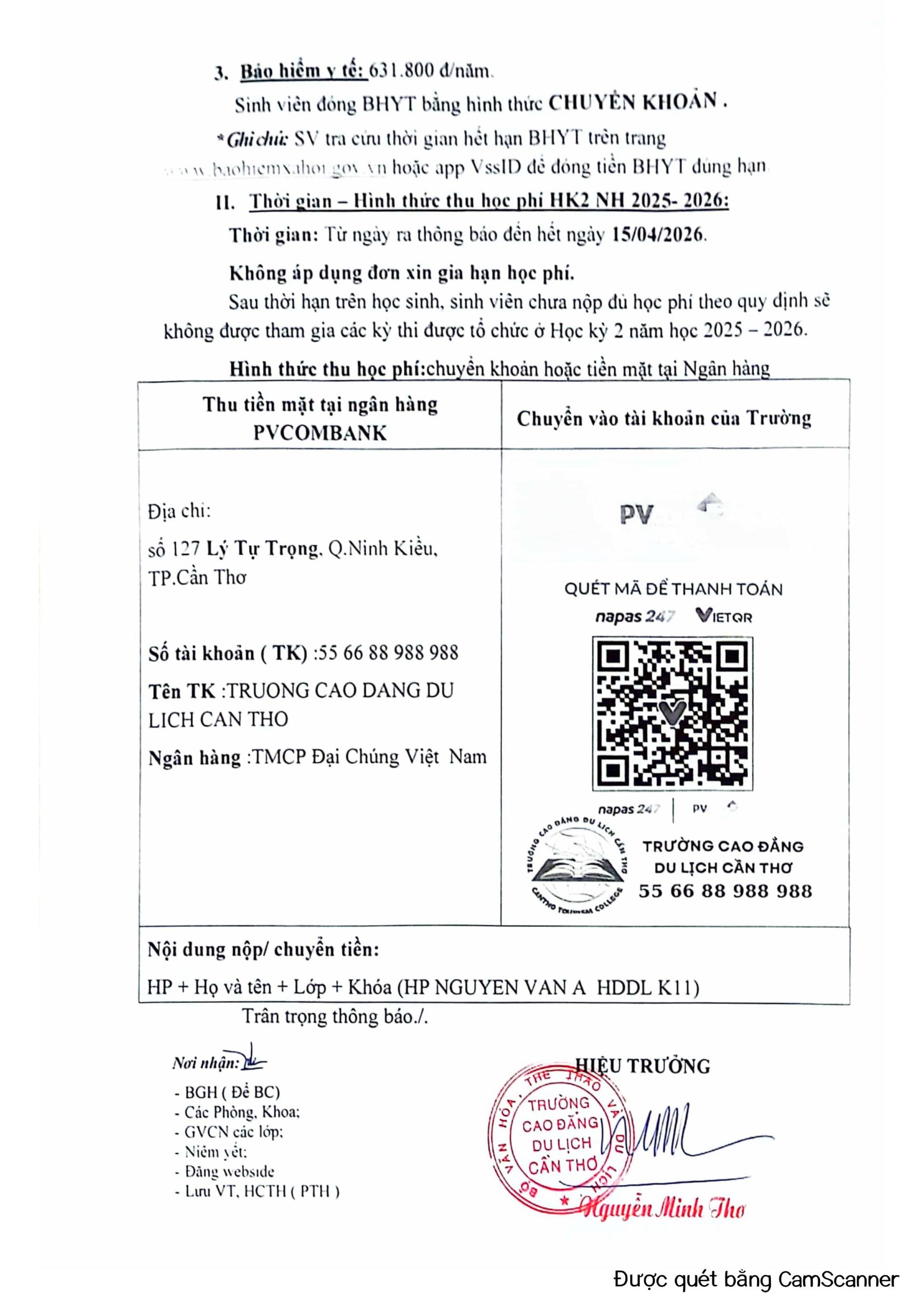 Học phí HK2 (NH: 2025-2026) và HK1 (NH: 2026-2027)