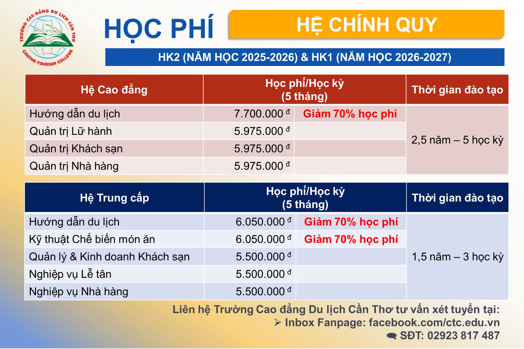 {"id":733703,"name":"Học phí HK2 (NH: 2025-2026) và HK1 (NH: 2026-2027)","desc":"","content":"<figure class=\"image\"><img src=\"\/datafiles\/25948\/upload\/images\/2026-01\/HP 2526(3).jpg\"><\/figure><p> <\/p><figure class=\"image\"><img src=\"\/datafiles\/25948\/upload\/images\/2026-01\/21-TB thu học phí HK2, NH 2025-2026_2-images-0.jpg\"><\/figure><figure class=\"image\"><img src=\"\/datafiles\/25948\/upload\/images\/2026-01\/21-TB thu học phí HK2, NH 2025-2026_2-images-1.jpg\"><\/figure><hr><p> <\/p><figure class=\"image\"><img src=\"\/datafiles\/25948\/upload\/images\/2026-01\/16-QD ban hanh muc thu phi, le phi doi voi HSSV he chinh quy HK2, NH 202-2026 va HK1 NH 2026-2027_1-images-0.jpg\"><\/figure><figure class=\"image\"><img src=\"\/datafiles\/25948\/upload\/images\/2026-01\/16-QD ban hanh muc thu phi, le phi doi voi HSSV he chinh quy HK2, NH 202-2026 va HK1 NH 2026-2027_1-images-1.jpg\"><\/figure>","image_url":"https:\/\/www.ctc.edu.vn\/datafiles\/25948\/upload\/images\/TIN%20T%E1%BB%A8C.png","image_thumb_url":"https:\/\/www.ctc.edu.vn\/datafiles\/25948\/upload\/thumb_images\/TIN%20T%E1%BB%A8C.png","tags":["Học phí","cao đẳng du lịch cần thơ","xét tuyển 2026"],"count_view":485,"seo_name":"hoc-phi-hk2-nh-2025-2026-va-hk1-nh-2026-2027","date_update":1769079600,"date_created_format":1769079976,"meta_title":"","meta_desc":"","meta_keyword":"Học phí,cao đẳng du lịch cần thơ,xét tuyển 2026","qr_code":"https:\/\/www.ctc.edu.vn\/hoc-phi-hk2-nh-2025-2026-va-hk1-nh-2026-2027","title_page":"Tin tức","relate_object_id":733703,"company_logo":"https:\/\/www.ctc.edu.vn\/datafiles\/25948\/upload\/files\/LG1.png?t=1752835478","company_name":"ctc.edu.vn","company_email":"tcdlct@gmail.com","company_phone":"0292 3815 252","company_address":"Số 47 Đường số 1, KV3 Sông Hậu, Phường Cái Khế, TP. Cần Thơ","company_fax":"","date_now":1776402336,"company_tags":[],"search_keyword":null,"facebook_comment":"https:\/\/www.ctc.edu.vn\/hoc-phi-hk2-nh-2025-2026-va-hk1-nh-2026-2027","breadscrumb":[{"url":"https:\/\/www.ctc.edu.vn","name":"Trang chủ","icon":"","active":false},{"url":"https:\/\/www.ctc.edu.vn\/tin-tuc","name":"Tin tức","icon":"","active":false},{"url":"https:\/\/www.ctc.edu.vn\/tin-hoat-dong-cua-truong","name":"Tin hoạt động của Trường","icon":"","active":true}],"list_products_tmp":[],"list_section":[{"id":179188,"name":"SECTION-336","seo_name":"#w30s-section-179188","url":"#w30s-section-179188"},{"id":179189,"name":"SECTION-30274","seo_name":"#w30s-section-179189","url":"#w30s-section-179189"},{"id":179210,"name":"SECTION-26765","seo_name":"#w30s-section-179210","url":"#w30s-section-179210"}],"type_page":7,"id_page":91443,"widget_3949880":{"content_data":{"content":"Từ khóa:<br>"}},"widget_3949883":{"content_data":{"content":"BÀI VIẾT \/ TIN TỨC"}},"widget_3949884":{"content_data":[{"id":740329,"name":"Bàn giao nhiệm vụ Bộ trưởng Bộ Văn hoá, Thể thao và Du lịch","desc":"","content":"<p style=\"text-align:justify;\"><span style=\"font-size:19px;\">Chiều 9.4.2026, Bộ Văn hóa, Thể thao và Du lịch tổ chức Lễ bàn giao nhiệm vụ Bộ trưởng giữa Ủy viên Ban Chấp hành Trung ương Đảng khoá XIII, Bí thư Đảng ủy, Bộ trưởng Bộ Văn hóa, Thể thao và Du lịch nhiệm kỳ 2021-2026 Nguyễn Văn Hùng và Uỷ viên Ban Chấp hành Trung ương Đảng khoá XIV, Bí thư Đảng uỷ, Bộ trưởng Bộ Văn hoá, Thể thao và Du lịch nhiệm kỳ 2026-2031 Lâm Thị Phương Thanh.<\/span><\/p><p style=\"text-align:justify;\"><span style=\"font-size:19px;\">* Nguồn: <\/span><a href=\"https:\/\/baovanhoa.vn\/chinh-tri\/ban-giao-nhiem-vu-bo-truong-bo-van-hoa-the-thao-va-du-lich-218103.html\"><span style=\"font-size:19px;\">https:\/\/baovanhoa.vn\/chinh-tri\/ban-giao-nhiem-vu-bo-truong-bo-van-hoa-the-thao-va-du-lich-218103.html<\/span><\/a><\/p><figure class=\"image\"><img src=\"\/datafiles\/25948\/upload\/images\/2026-04\/4197360521355935907.jpg\"><\/figure><figure class=\"image\"><img src=\"\/datafiles\/25948\/upload\/images\/2026-04\/2635702874504759428 (1).jpg\"><\/figure><figure class=\"image\"><img src=\"\/datafiles\/25948\/upload\/images\/2026-04\/4197360521355935907 (1).jpg\"><\/figure><figure class=\"image\"><img src=\"\/datafiles\/25948\/upload\/images\/2026-04\/2635702874504759428.jpg\"><\/figure><figure class=\"image\"><img src=\"\/datafiles\/25948\/upload\/images\/2026-04\/760962980696670280.jpg\"><\/figure><figure class=\"image\"><img src=\"\/datafiles\/25948\/upload\/images\/2026-04\/798230902412270477.jpg\"><\/figure><figure class=\"image\"><img src=\"\/datafiles\/25948\/upload\/images\/2026-04\/4148211866178712637.jpg\"><\/figure>","image_url":"https:\/\/www.ctc.edu.vn\/datafiles\/25948\/upload\/images\/TIN%20T%E1%BB%A8C.png","image_thumb_url":"https:\/\/www.ctc.edu.vn\/datafiles\/25948\/upload\/thumb_images\/TIN%20T%E1%BB%A8C.png","tags":"","count_view":31,"seo_name":"ban-giao-nhiem-vu-bo-truong-bo-van-hoa-the-thao-va-du-lich","date_update":1775782020,"date_created_format":1775782348,"meta_title":"","meta_desc":"","meta_keyword":"","qr_code":"https:\/\/www.ctc.edu.vn\/ban-giao-nhiem-vu-bo-truong-bo-van-hoa-the-thao-va-du-lich"},{"id":739784,"name":"THÔNG BÁO TRIỆU TẬP HSSV THAM DỰ LỄ TỐT NGHIỆP & NGÀY HỘI VIỆC LÀM 2026","desc":"","content":"<p><img src=\"https:\/\/static.xx.fbcdn.net\/images\/emoji.php\/v9\/tba\/1\/16\/1f4e3.png\" alt=\"????\"><img src=\"https:\/\/static.xx.fbcdn.net\/images\/emoji.php\/v9\/t25\/1\/16\/1f393.png\" alt=\"????\"> THÔNG BÁO TRIỆU TẬP HSSV THAM DỰ LỄ TỐT NGHIỆP & NGÀY HỘI VIỆC LÀM 2026<\/p><p><a href=\"https:\/\/www.facebook.com\/ctc.edu.vn?__cft__[0]=AZbfiDrN94kgHlAJyBfB3hhJ8XesnBYheWNFmFajGksR-BdszUDCRIjKZYWgV-2j8njUmXuE_HHPXA0YqArT5vER6AnuifdEjNsa_nwWvoQ1t-mBha_pLWueSie2PgLzRf03ihaHi1KZPlN56hr-OR4n&__tn__=-]K-R\"><strong>Trường Cao đẳng Du lịch Cần